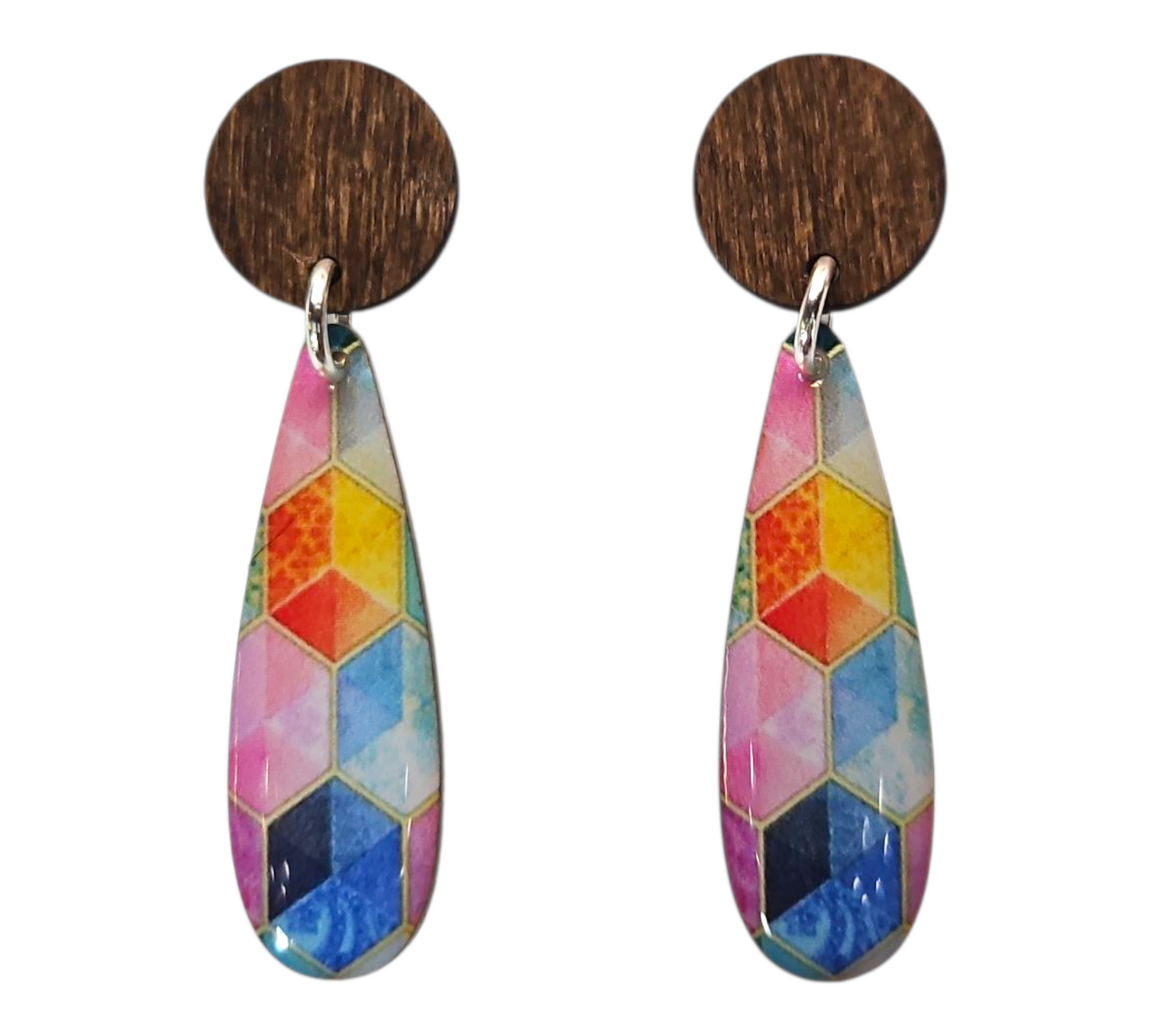 RAINBOW CUBES/WOOD SLIM DROP EARRINGS (In Wooden Gift Box)